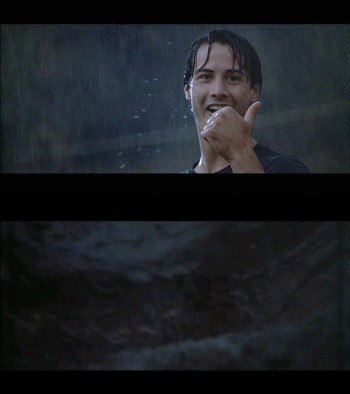 Enfin, le générique dans son final s’attarde sur le visage souriant de Johnny. Il vient de boucler le parcours dans un temps satisfaisant son instructeur. L’agent peut être fier de lui. Il a l’air heureux et rien ne semble pouvoir altérer cet état. Sauf que le générique se conclue sur un ultime ride du surfeur recouvrant l’écran d’eau, la caméra ayant plongé dans le rouleau. Johnny Utah est prêt d’être submergé.