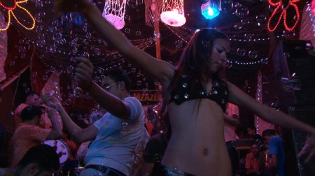 Aux scènes de faste apparent, où l’éclat d’une Égypte festive, chantante et parée de trésors anciens s’efface devant les tractations et l’environnement « voyou » qui noyaute l’univers du mariage traditionnel, succèdent des séquences plus crues (comme le langage de Reda…) orchestrées comme des jeux de pouvoir. Dans le déploiement autoritaire de Reda se profile inconsciemment l’image d’un Chef d’État qui sait que ses « fidèles » ne le suivront plus longtemps, et que la révolution couve au sein du peuple. Plus prosaïquement, c’est dans le choc entre la modernité et l’ancestralité, entre l’aspect charnel des danseuses et l’articifialité froide, mécanique, des relations d’affaires conclues entre Reda et tel futur mari (pour le recrutement d’une danseuse), que le documentaire fait la démonstration de ses points forts. La Nuit elles dansent serpente dans les rues du Caire, caméra à l’épaule, dénichant le paradoxe de ces femmes prisonnières d’une condition et pourtant libérées par l’exercice de celle-ci. Sur le grain vidéo du film de Lavigne et Thibault se dépose alors une fine couche de malaise social – la toxicomanie d’Amira, le défilé des prétendants, les menaces sourdes de clients mécontents prêts à des représailles…