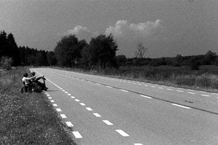 Dialogues rares, rudesse des paysages et des personnages, rythme lent, valeurs de solidarité et de fraternité servies avec deux litres de rouge et du gros rock qui tache : Aaltra est un hommage sans fard au réalisateur d’Au loin s’en vont les nuages. C’est vers Kaurismäki lui-même que mène la route parcourue par les deux estropiés à bord des fauteuils roulants. C’est lui qui les accueillera avec une cigarette au coin des lèvres et les prendra sous son aile. Ne doutant de rien, Délépine et Kervern sont en effet parvenus à convaincre le réalisateur d’interpréter le rôle du chef de l’entreprise Aaltra pour les derniers plans du film. Kaurismäki est le responsable d’Aaltra : une phrase dans laquelle le mot « responsable » revêt tout ses sens. S’escrimant à approcher la beauté des plans de Kaurismäki, Délépine et Kervern disent également vouloir faire un cinéma sur les laissés pour compte, suivant les traces du maître finlandais. Leur dernier film Mammuth aborde les maigres retraites, Louise-Michel la nouvelle condition ouvrière, et Avida peut se lire comme une incursion surréaliste dans la folie. Dans Aaltra, les handicapés sont au cœur du propos. Plusieurs films avaient déjà abordé le thème du handicap moteur, traité le plus souvent sous un angle dramatique. Pas de quoi se faire mal aux côtes avec une séance de Breaking the waves ou de Mar Adentro. Si la situation du handicap n’a rien de drôle, son exploitation par Délépine et Kervern se révèle très amusante : les deux paraplégiques du film sont des cons comme les autres, des êtres qui savent être vénaux ( ils profitent de leur handicap pour louer des places de parking réservées aux handicapés), ingrats (l’un d’eux dévorera à lui seul un repas servi à une famille de quatre personnes), voleurs (ils dérobent une moto de compétition lors d’un concours). De quoi donner une belle migraine aux organisateurs du Téléthon. Ces vices les rendent pourtant profondément attachants, car ils font des deux protaganistes des êtres vivants et libres. Aaltra prolonge ainsi tout ce que MacMurphy tentera de faire comprendre aux internés dans Vol au-dessus d’un nid de coucou : l’évasion est toujours possible. Nos deux camarades ne finiront pas lobotomisés, mais embauchés par Aaltra, cette entreprise qu’ils souhaitaient faire couler. Employés par un Kaurismäki toujours bienveillant…