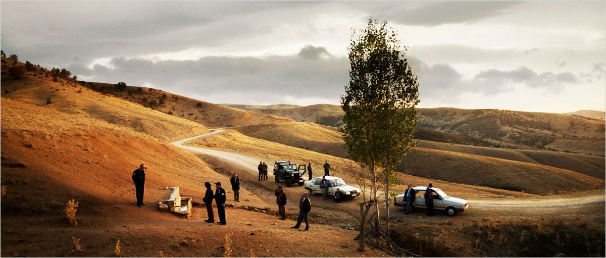 A cet égard, la longue introduction d’Il était une fois en Anatolie en est un exemple d’une richesse incroyable. Passé un prologue dont on peine à se souvenir une fois le film mis en marche, ce dernier s’installe dans l’obscurité de la nuit turque pour suivre un convoi de la gendarmerie qui passera la nuit, en compagnie du suspect numéro un d’un meurtre, à essayer de retrouver l’endroit où a été enterré le cadavre dans une vallée. Et Nuri Bilge Ceylan de commencer à faire ce qu’il sait faire de mieux, d’entrée de jeu : planter un décor et une ambiance de façon magistrale, laissant le temps à la rétine du spectateur d’imprégner les moindres détails du plan, comme on se retrouverait face à une toile de maître, submergé. Il faut voir comment les voitures s’avancent petit à petit dans le cadre, sur une route dont les phares des automobiles rendent la poussière on ne peut plus cinégénique. La matière est en action, car derrière une certaine distance revendiquée, Ceylan ne filme pas autre chose que la vie dans ses moindres détails, parfois cruels, toujours humains. Ce film là est d’autant plus intéressant qu’il permet à son auteur de s’aventurer dans le cinéma de genre pour la première fois.