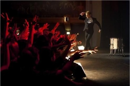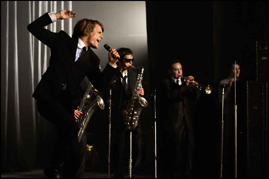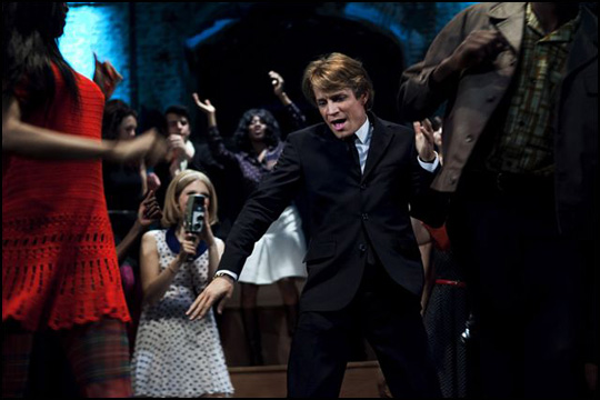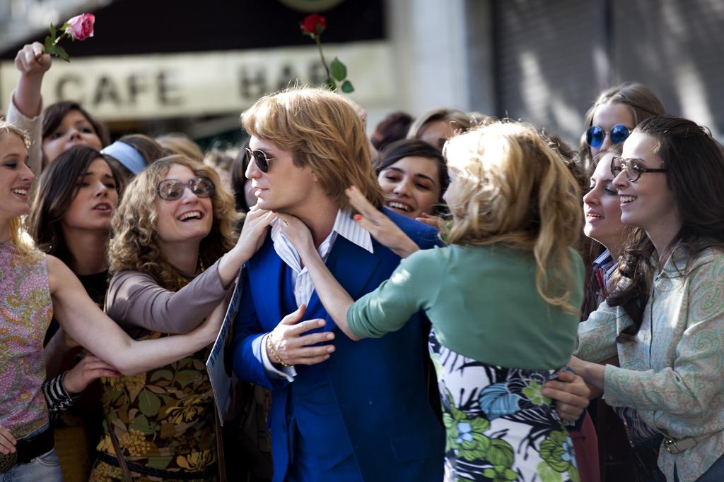 Autre exploit, le film parvient à retranscrire avec une grande authenticité les différentes ambiances associées aux années cinquante, soixante et soixante-dix, trois décennies traversées par l’ouragan blond. Ce souci de contextualisation, on le retrouve dans tous les autres films de Siri et se voit ici porté à son paroxysme. Un regain de crédibilité rendu possible grâce au casting – Jérémie Renier dans le rôle titre en tête (à la fois d’une ressemblance troublante et préservant sa singularité pour livrer son interprétation du personnage) et une mention spéciale aux grappes de jolies filles représentant les groupies de la star, toutes plus belles les unes que les autres, celles mises en avant rivalisant alors de beauté mais surtout de charisme – et à la manière de façonner la réalité du film en mêlant dans un même montage images d’archives et fictives pour l’occasion « maquillées » comme celles d’époque, ce qui contribue à parfaire l’illusion (on peut ainsi mettre en exergue une affiche de concert montrant Claude François dans une célèbre pose ici prise par l’acteur). Surtout, Cloclo, de par sa mise en scène est avant tout un film de cinéma. Le terme biopic employé par beaucoup pour définir la catégorie d’appartenance du film de Siri apparaît même terriblement réducteur quand il conviendrait de parler plutôt de bio épique tant la réalisation imprime une ampleur aux images, entre les mouvements de foule et l’élargissement du cadre dans les même proportions des scènes où Claude François se produit.