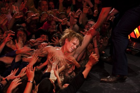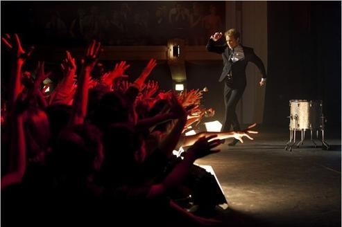 Il en va de même pour Cloclo, le chanteur se mesurant sans cesse au fantôme de son père et son enfance déchue tout comme il est prisonnier des contingences, celles du vedettariat (incarnées par Lederman lui rappelant constamment qu’il ne peut se contenter de jouir du succès présent et sans relâche chercher à innover sous peine d’être dépassé, pire oublié) et la masse du public avide de le toucher, de le caresser, l’embrasser et l’absorber. Voir la superbe scène où il se jette dans la foule bordant la scène et semble s’y noyer. A plusieurs reprises, on ressent ce désir de s’abandonner complètement, de ne plus s’appartenir, de se dissoudre dans la mer humaine à ses pieds (ce qui renvoie à cette image de lui enfant regardant passer au bord du ponton ce cargo, promesse d’un ailleurs à défricher). Soit la fin de l’Ego.