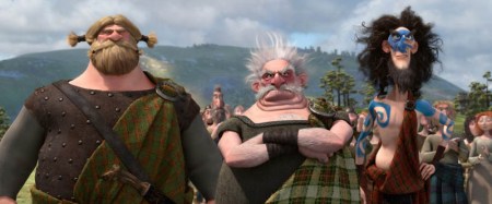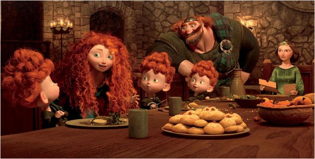 Signalons également la transfiguration de l’opposition hommes/femmes où ces dernières apparaissent comme des contrepoints de sagesse et de délicatesse face aux mâles représentés comme immatures, irresponsables (toujours prompts à déclencher une rixe) et monstrueux (par le biais d’une analogie très marquée, ce sont des ogres en puissance : les trois frères gloutons passent leur temps à s’empiffrer, le roi dévore goulument les victuailles à sa table). L’orientation d’Elinor, du fait de sa transformation, vers cette animalité larvée et constitutive est d’ailleurs remarquablement énoncée lors du formidable pré-générique montrant Mérida enfant jouant à cache-cache avec sa mère, cette dernière feignant de vouloir la trouver pour mieux la manger. De plus, cette séquence définie les autres forces mythiques et magiques qui seront à l’œuvre par la suite (les feux-follets, l’immense Mor’du) et avec lesquelles Mérida devra composer. Cette cohabitation du monde légendaire et du monde réel, le premier se situant à la lisière du second, est ainsi en germe et cette première séquence permet d’établir d’emblée que ces univers seront amenés à s’interpénétrer de part l’action, le positionnement de Mérida.
