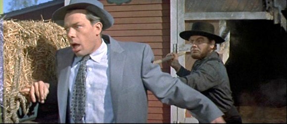 Dans un film comme celui-ci, très expressif par sa géométrie (utilisation du Cinémascope, jeu sur les décors et les repérages qui en sont faits par les personnages – le directeur / voyeur aussi bien que les cambrioleurs), il est intéressant de concevoir le schéma structurel d’ensemble plutôt que les seules parties. Les deux pôles du film le divisent ainsi en deux genres coexistant : d’un côté le film noir à travers les braqueurs et leur objectif vénal (personnages taciturnes, parmi lesquels on reconnaît Lee Marvin dans un petit rôle ; habillage visuel des codes du thriller, avec ses chambres d’hôtel miteuses, ses repérages à la banque, sa scène finale d’affrontement, etc.) ; de l’autre le mélodrame à travers la vie, mise à nue, de quelques citoyens, mélodrame progressivement contaminé par le film noir dont les tentacules commencent à darder dès la scène d’ouverture : on y assiste à une soudaine explosion au cœur de la mine qui ne trouve aucun écho dans les minutes qui suivent, sinon dans la scène de clôture qui referme ainsi le cercle de la violence. On remarque également que les habitants de Bradenville peuplent un espace fermé sur lui-même qui commence par imploser (image de l’explosion primordiale), laisse dès lors pénétrer des éléments extérieurs à son écosystème, tel un organisme infiltré par un virus aux intentions voilées, avant de devoir apprendre à se défendre contre ces cellules agressives à l’aide d’une poussée extérieure : la famille Amish, traditionnellement exclue du corps principal parce que marginale.