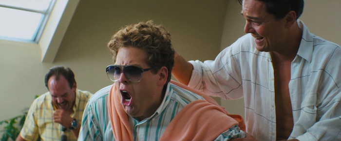 Scorsese n’hésite pas à forcer le trait d’une représentation métaphorique en accentuant le caractère sectaire (il faut voir les regards hallucinés et la ferveur des disciples buvant le prêche du prédicateur Belfort) et tribal de leur société (le chant du mentor de Belfort – génial McConaughey – repris par les employés, leur comportement à la limite de l’animalité lorsqu’ils s’éclatent). De sorte que la séduction initiale de ce monde opulent se craquelle pour laisser place à une sauvagerie et une violence intrinsèques jusqu’ici contenues. Une image, un geste traduit parfaitement cette obscénité, lorsque en préambule d’une fête donné suite au premier succès, une femme se laisse tondre la chevelure et reçoit en échange quelques billets supplémentaires. Une humiliation particulièrement choquante tant le symbolisme est fort et renvoie à l’image de ces femmes tondues à la libération.