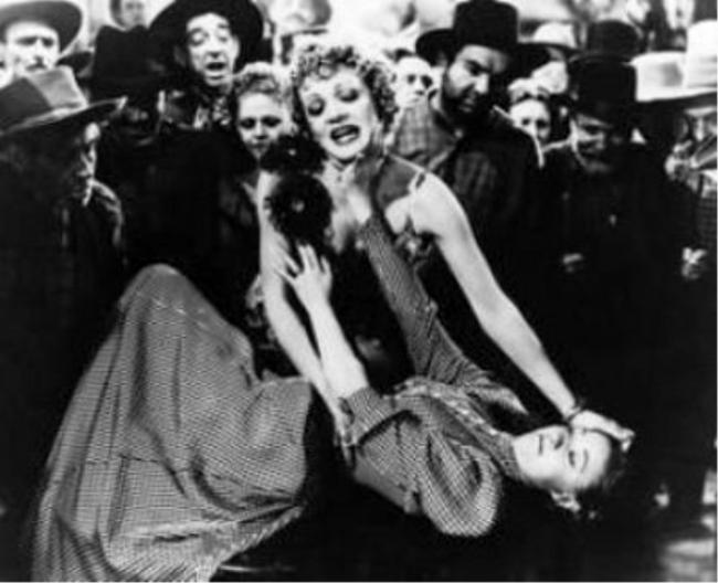 Ce cinéma sous héroïnes est contagieux : les Français s’en emparent et, désormais, on ne peut plus vivre une révolution mexicaine sans Maria y Maria aux commandes d’une mitrailleuse (Viva Maria, 1965, Louis Malle). Ou imaginer un western sans deux cow-girls qui se crêpent le chignon chemises baillantes (Les pétroleuses, 1971, Christian-Jaque). Mais, au pays des pionniers, Bardot et Cardinale ne sont pas pionnières. Des bagarres de filles, les westerns en regorgent, la plus mémorable étant sans doute celle qui oppose Una Merkel à Marlene Dietrich dans Destry Rides Again (1939, Femme ou démon) de George Marshall. Les deux furies s’empoignent, roulent d’abord sur une table puis à terre, s’accrochent à tout ce qu’elles trouvent, une mèche de cheveux ou un bout d’étoffe pour la plus grande joie du public du saloon.