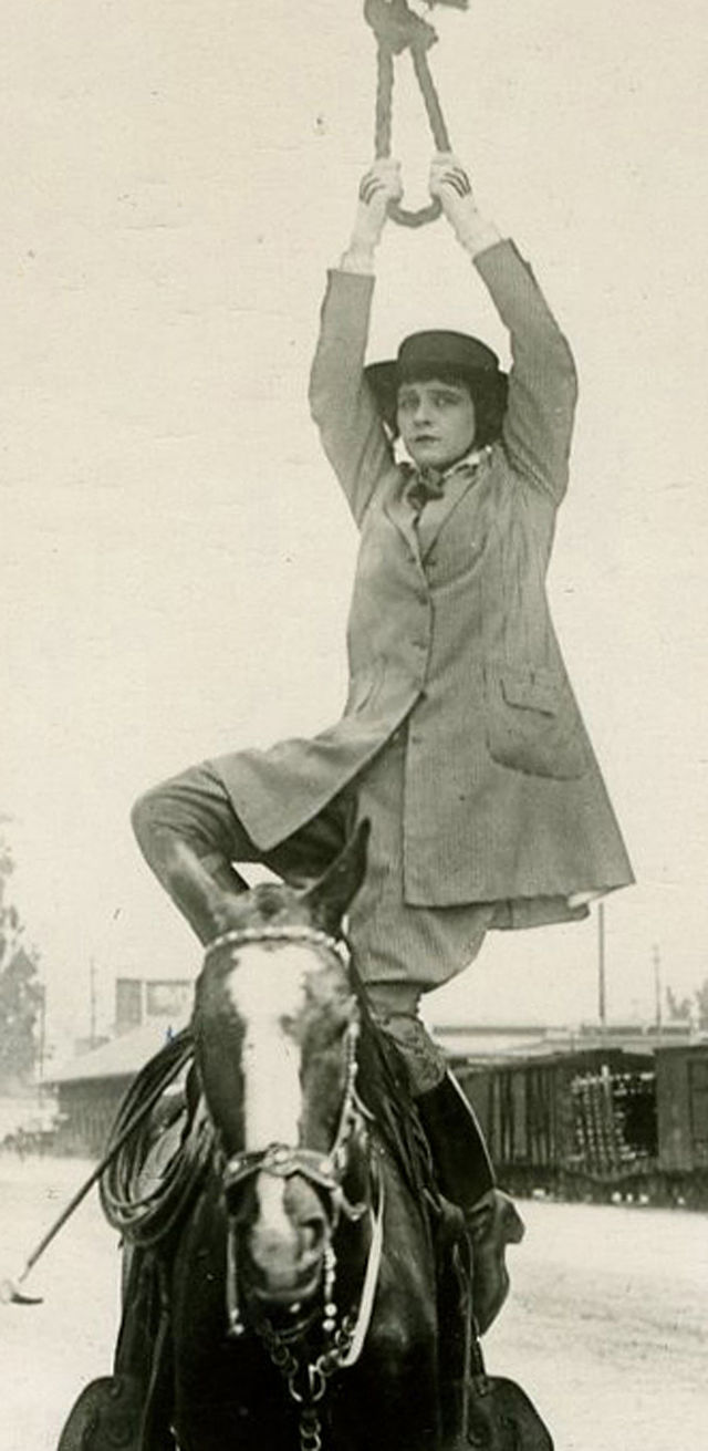 Mais ne croyez pas qu’après cela la jeune femme se repose. Pearl saute sur un cheval, galope, rejoint le méchant, lui saute dessus, se bat avec lui en roulant dans l’herbe, se prend une manchette, tombe groggy dans un fossé, remonte et continue. Dans The Hazards of Helen (1914), sa concurrente directe, Helen Holmes, poursuit un train en moto. Elle est d’ailleurs capable de sauter dans le train à partir d’une auto ou d’un cheval au galop et de réaliser tellement de prouesses qu’elle contribue, sans le savoir, au travail d’émancipation des Américaines. N’oublions pas qu’en 1913, certaines se battent encore pour l’adoption par le Congrès d’un amendement accordant le droit de vote aux femmes à l’échelle fédérale (certains états l’ont reconnu dès le milieu du XIXe siècle, d’autres non).
