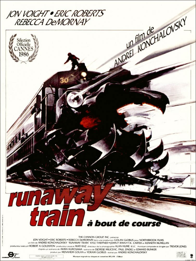 De toutes les productions viriles du trublion Menahem Golan – toujours associé, pour l’occasion, à son cousin Yoram Globus –, Runaway Train (1985) reste sans aucun doute la plus mémorable, eu égard à l’intelligence viscérale de son script (on y reviendra) et de sa réalisation carrée, efficace, véloce malgré la pesanteur de son sujet. Jugez plutôt : des brutes épaisses (Jon Voight et Eric Roberts) s’évadent d’une prison de haute sécurité en Alaska et montent à bord d’un train que plus personne ne semble pouvoir arrêter suite à la mort subite de son conducteur. Pour compliquer le tout, le directeur de la prison, Ranken (John P. Ryan), une canaille cruelle en plein « trip » de pouvoir et qui ne vaut pas mieux que ceux qu’elle garde enfermés parfois comme des animaux, se lance à leur poursuite en hélicoptère. Bref, les uns courent après leur liberté – ou plutôt leur statut d’hommes libres –, les autres tentent de freiner, sinon l’élan des deux fuyards, au moins la course folle du convoi dont l’incontrôlable vitesse risque d’engendrer tôt ou tard une catastrophe ferroviaire et environnementale. Et entre ces deux groupes d’individus s’immisce une figure féminine, une mécanicienne providentiellement surgie d’un des wagons (Rebecca DeMornay, loin de l’aura sexy qu’elle dégageait deux ans plus tôt dans Risky Business). Du noir aux joues, les cheveux en bataille, des yeux bleus scrutant tour à tour avec inquiétude l’immensité neigeuse que transperce la locomotive et la bestialité de ses infortunés compagnons de voyage, Sara se pose comme l’élément perturbateur de cet univers masculin uniquement fait de sang, de sueur, de graisse. C’est que Runaway Train illustre avec véhémence que, pour s’en sortir dans la vie, il ne faut pas hésiter à mettre les mains dans le cambouis (les deux taulards commencent même par s’en couvrir entièrement pour mieux faire face au grand froid qui les attend hors des murs de la prison). Mais tout, dans cette histoire, est aussi affaire de mental, comme le scande, allumé d’un brin de folie furieuse aux trois-quarts du film, Oscar « Manny » Manheim (Voight), bagnard aveuglé par la haine du monde et par trois années passées enchaîné au mitard. Ce personnage antipathique, dénué d’amabilité mais fascinant, qui ne cesse de dire à son acolyte le boxeur / violeur Buck (Roberts) qu’il n’a décidément « pas de cervelle », ne cherche, au fond, qu’à passer de l’ombre à la lumière. De la noirceur d’une cellule plongée depuis des lustres dans l’obscurité à la blancheur des paysages enneigés de l’Alaska, le train fait office de fil conducteur, de véhicule vers la libération, de moyen de passage d’un état à un autre. La liberté ou la mort ? Peut-être bien les deux pour des protagonistes qui, même loin des murs de l’affreuse prison de Stonehaven, semblent toujours rester prisonniers – de la fatalité d’un système, de la dureté de l’existence. Et le film du Russe Konchalovsky de revêtir une dimension symbolique qui transcende son statut de spectacle pur et dur. Car « dur », Runaway Train peut en effet se targuer de l’être, et pas qu’à moitié !