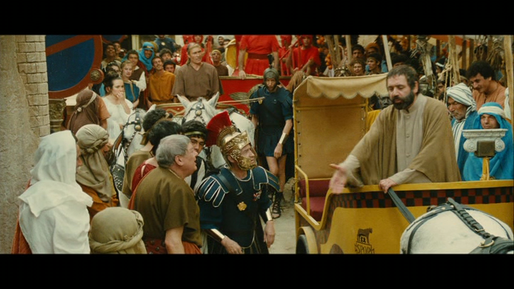 Lorsqu’en 1972, Jean Yanne décide de se lancer dans la mise en scène et signe Tout le monde il est beau tout le monde il est gentil, la surprise est de taille et le succès au rendez-vous. Le comique a des choses à dire, ce dont on se doutait, des comptes à régler aussi (entre autres avec la radio) et le public suit. Dix ans après, alors qu’il a enchaîné avec deux films réjouissants (Moi y’en a vouloir des sous et Les Chinois à Paris) et deux autres ayant moins retenu l’attention (Chobizenesse et Je te tiens, tu me tiens par la barbichette), Yanne s’attelle à une production beaucoup plus ambitieuse avec Deux heures moins le quart avant Jésus-Christ (un titre dans la veine de son auteur). À la même époque, Mel Brooks vient de sortir La folle histoire du monde. Malgré la sympathie que dégagent ces deux personnalités, l’Américain et le Français, force est de reconnaître que ces deux épopées à costumes perdent un peu du souffle si on les compare aux succès qui ont jalonné la carrière des deux amuseurs. Et restent loin derrière La vie de Brian, modèle du genre. Peut-être manque-t-il à Deux heures moins le quart la patte de Gérard Sire, qui a co-écrit tous les films de Jean Yanne et qui disparaît en 1977, alors que Je te tiens, tu me tiens n’est pas encore sur les écrans.