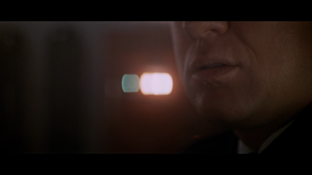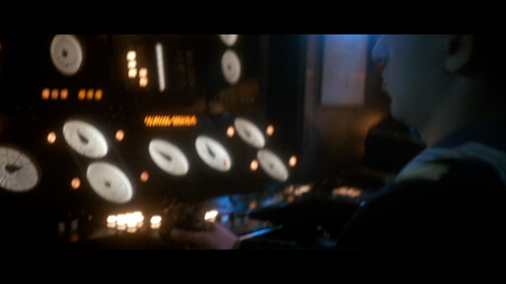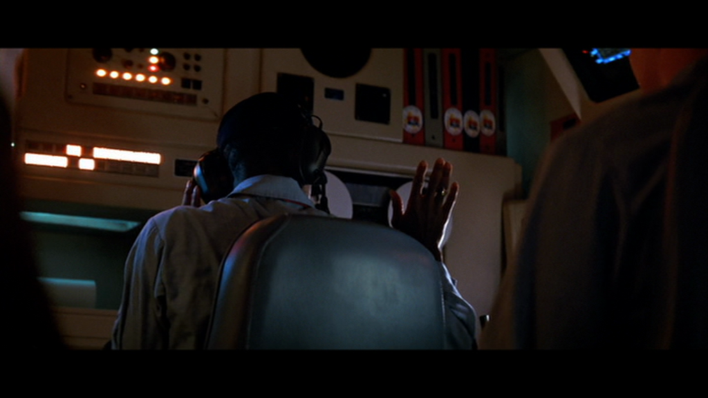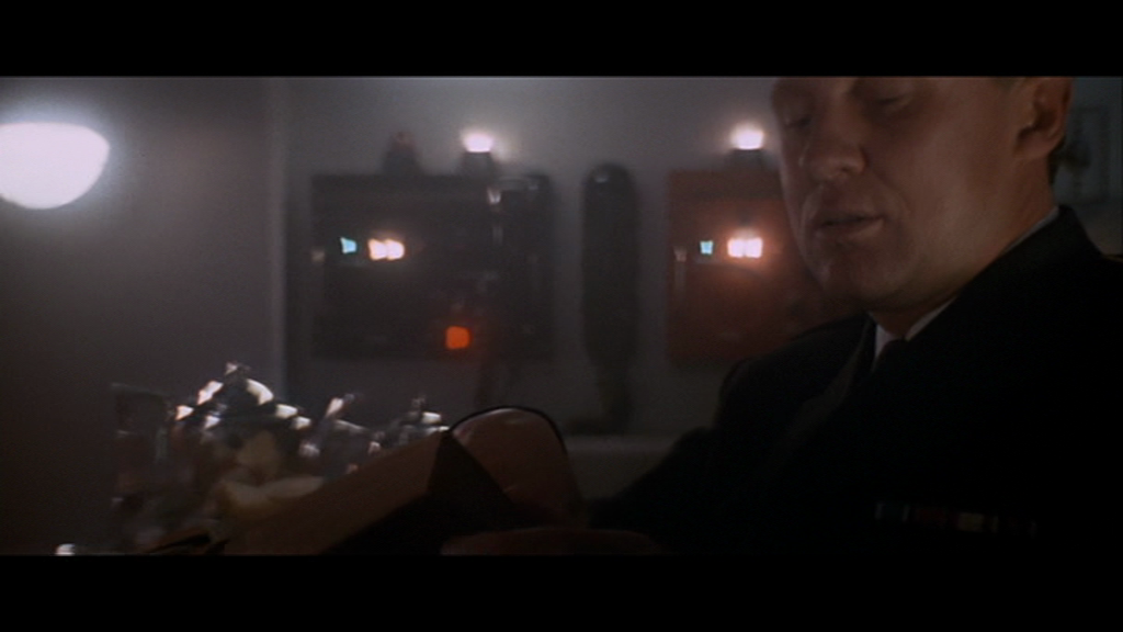 Toutefois, c’est moins la cohérence des échelles de plans que le montage qui confère à cette séquence toute sa puissance évocatrice. McTiernan nous extraie régulièrement de cette conversation intimiste pour insérer des plans intrus, qu’il s’agisse de l’équipage de l’Octobre Rouge en pleine action ou des hommes à bord du Dallas. Parallélisme logique en vertu de la dramaturgie, puisque ces événements se déroulent en même temps : n’oublions pas que le Dallas suit de près l’Octobre Rouge, et que les matelots de celui-ci poursuivent leurs opérations malgré l’absence sur le pont de leur commandant. Mais cette alternance expose avant tout une dramaturgie différente, en pointillés : une dramaturgie humaine et psychologique qui passe par la souveraineté du langage. Au moment où Borodin pose sa question sur le Montana, et après un court plan sur Ramius qui le regarde, un insert nous montre Jones, le radio du Dallas, chaussé de ses écouteurs, qui retombe sur son siège avec un air concentré, comme si, à cet instant précis, il pouvait entendre la conversation entre les deux hommes. C’est aussi ce que la continuité sonore nous laisse à penser, car si la question de Borodin ne dépasse pas sonorement le cadre de la cabine, le silence de Ramius se prolonge par le silence de Jones – avant un retour à la cabine du commandant. Ce n’est donc pas le son des voix, mais bien le silence, qui relie ces deux espaces a priori opposés.