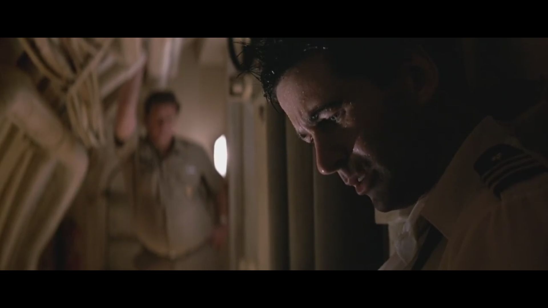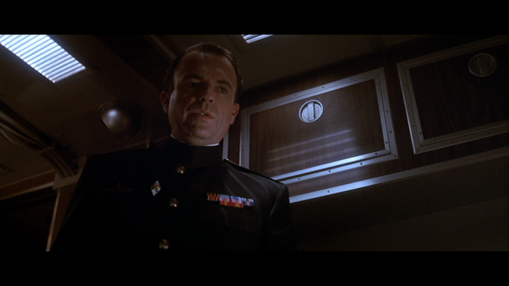 Mais l’alternance de plans la plus importante, et la plus « parlante », est celle qui illustre le soliloque de Ramius sur ses quarante ans passés en mer. Tandis qu’il parle, McTiernan monte alternativement des images des deux sous-marins vus de l’extérieur, puis les ponts de chacun des bâtiments habité par les visages concentrés des membres d’équipage. Le réalisateur a subtilement instauré un moyen de reconnaître à quel sous-marin nous avons affaire : les matelots du Dallas regardent à gauche du cadre, ceux de l’Octobre Rouge sont tournés vers la droite. Et tout le monde semble écouter silencieusement – religieusement – non pas les échos de la chorégraphie des sous-marins, mais la confession de Ramius prononcée devant l’Éternel. Le discours d’un homme qui a choisi d’en finir avec une vie consacrée à une guerre inutile, vouée à un idéal de pacotille, alors qu’il a perdu l’essentiel de ce qui aurait dû la remplir. Le temps d’un court monologue, l’action suspend son vol et tout le monde s’arrête, les oreilles grandes ouvertes.