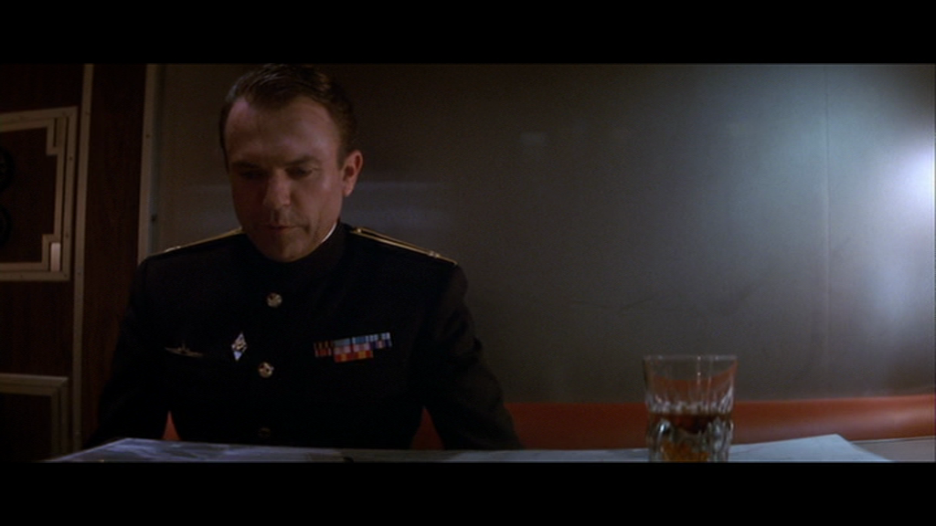 La conversation entre Ramius et Borodin signale un moment d’apaisement dans la dramaturgie du film, avant que les événements ne s’accélèrent : quelques minutes plus tard, Ryan parvient à rejoindre le bord du Dallas et à communiquer avec le commandant adverse, amorçant la phase finale de défection des officiers soviétiques. À partir d’une menace évasive – celle d’un possible nouveau sabotage, et son corollaire, une potentielle réaction au sein d’un équipage qui a pris conscience de cette épée de Damoclès – McTiernan transforme la séquence en émouvante confession partagée. Alors qu’il tourne les talons pour quitter la cabine de son commandant, Borodin revient sur ses pas pour entretenir son supérieur et ami d’une question qui lui brûle les lèvres : « Pensez-vous qu’ils [les Américains] me laisseront m’installer dans le Montana ? » Le voilà qui déroule son rêve américain : une épouse plantureuse, un élevage de lapins, des hivers passés en Arizona, un pickup, et pourquoi pas un véhicule tout-terrain et une traversée du pays État par État – « Pas besoin de papiers ? » tient-il à s’assurer auprès de Ramius ; celui-ci, avec un sourire, confirme. Chez Borodin, le passage à l’Ouest est motivé par l’idéalisme d’une vision quasi-cinématographique du Nouveau monde, entre grands espaces ruraux (le Montana et l’Arizona sont parmi les États les plus sauvages) et liberté totale d’aller d’un endroit à l’autre. Il est remarquable que cette vision idéalisée s’oppose du tout au tout à l’esthétique d’un film dont le seul horizon, outre celui de l’océan sans limites, est celui des étroites coursives d’un bâtiment naval connu pour son extrême exiguïté, et dans lequel Borodin aura certainement passé une majeure partie de sa vie – et duquel, du reste, il ne sortira pas vivant, confinant le rêve à son état de potentialité. Remarquable, également, est cette négation subtile de l’élément marin dans le futur désiré par Borodin : le Montana montagneux et l’Arizona désertique ne possèdent aucune ouverture sur l’océan.