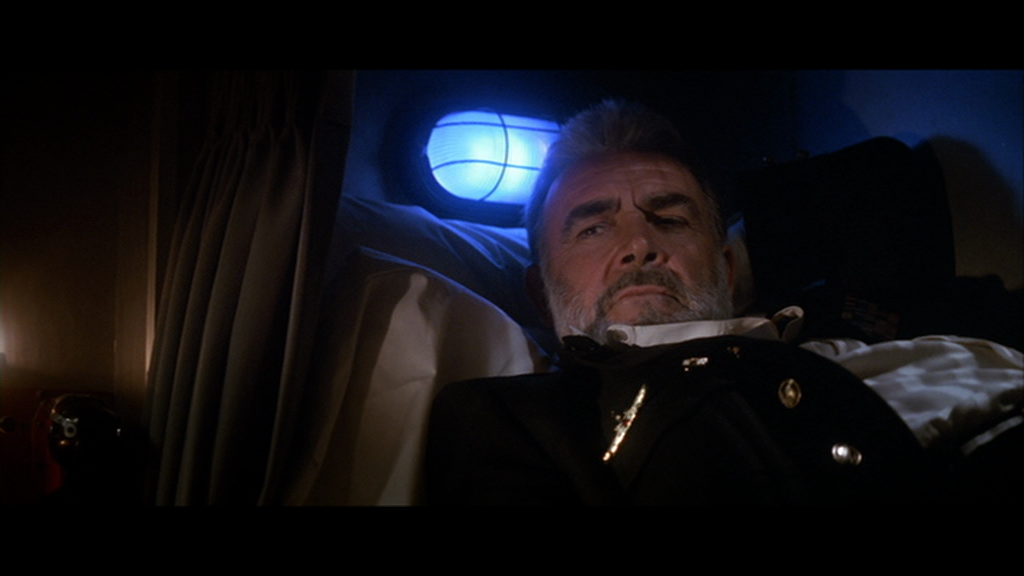 Borodin interroge à son tour Ramius sur ses aspirations, une fois qu’ils seront « de l’autre côté ». Le fier commandant commence par affirmer qu’il n’a « pas de tels appétits ». Puis, la voix quelque peu rêveuse, il révèle sa nostalgie des calmes parties de pêche de son enfance et la lassitude qui le gagne après quarante années passées à mener, sur mer, une guerre « sans batailles, sans monuments, parsemée de pertes humaines ». Ainsi que son regret, ultime, de n’avoir pas été présent pour sa femme, décédée un an plus tôt. « J’en ai fait une veuve le jour où je l’ai épousée. » Il y a, chez cet homme, une présence écrasante du passé, et le besoin légitime de trouver un lieu où l’officier pourra, enfin, laisser place à l’homme libre, désireux d’aller à la rencontre de la mort en effectuant un dernier et salutaire retour vers le monde de l’enfance – les paisibles parties de pêche. Le fait qu’il se confesse à Borodin confirme ce que la scène d’ouverture du film (Ramius et Borodin au sommet de l’Octobre Rouge) laissait augurer : que celui-ci joue le rôle d’un fils par procuration, un fils-soldat plus qu’un camarade-officier, que la promiscuité du service – et des lieux – lui a fait adopter presque naturellement. La mise en scène les lie délicatement. Si Borodin est d’abord filmé en contre-plongée, lorsqu’il évoque les menaces de sabotage, dominant Ramius d’un corps qui s’impose physiquement dans la cabine étriquée, tous deux sont bientôt captés à même hauteur, à même échelle, quand l’échange devient intime – dès lors qu’il commence à dérouler son rêve américain, Borodin prend place sur le siège situé près de la couchette sur laquelle Ramius est allongé. La façon qu’a Ramius de jouer négligemment d’un doigt avec son alliance, peut faire référence aussi bien au souvenir de sa femme disparue qu’à la présence de ce fils de substitution qui l’accompagne dans cet ultime voyage.
