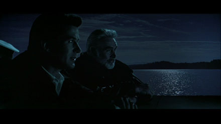 La dernière séquence du film – si l’on exclut le plan final de Ryan endormi dans l’avion du retour – reproduit à l’inverse le premier plan, qui voyait Ramius chevaucher fièrement l’Octobre Rouge en compagnie de Borodin. Cette fois, c’est avec Ryan, cet autre fils spirituel, qu’il observe le paysage depuis le sommet du sous-marin. Absorbé par la terre en vue, cette terre libératrice, idéalisée (mais pas parce qu’elle est américaine : parce qu’elle est une terre de repos), Ramius cite Christophe Colomb : « Et la mer offrira à chacun de nouveaux espoirs, comme le sommeil apporte les rêves. » Cette citation, faussement attribuée au découvreur du Nouveau monde, est en réalité signée du scénariste Larry Ferguson (coauteur du script avec Donald Stewart). Elle renvoie, de nouveau, Ramius à ses deux amours : la mer et le rêve.