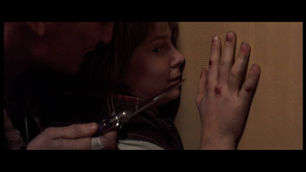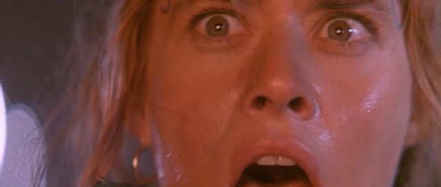 Et puis, rien de plus dramatique et impressionnant qu’une silhouette fugitive dont on ne peut deviner les intentions. Comme lorsque Danny Madigan, au moment de sortir de l’appartement miteux qu’il partage avec sa mère pour se rendre à l’avant-première spéciale et nocturne de Jack Slater IV, voit dans l’embrasure d ela porte le mouvement fugace d’un individu dans l’obscurité du palier. Ce dernier se précipitera dans l’ouverture et plaquera le garçon face au mur afin de lui voler du fric. On ne verra que tardivement le visage de l’agresseur, McT cadrant essentiellement le visage du gamin où se lisent ses réactions, renforçant le sentiment d’effroi confronté à un ennemi sans visage.
