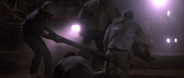 L’intensité onirique recherchée par McTiernan survient donc par différents moyens et c’est sans doute dans Medicine Man, film qui mérite d’être réévalué, qu’elle s’exprime le plus amplement. On passe ainsi du rêve au cauchemar en quelques scènes. Alors que le docteur Crane découvre avec émerveillement la forêt d’émeraude où vit Campbell (dans une séquence où le duo s’envole dans les airs grâce à un ensemble de cordes et poulies auxquels ils sont arnachés), elle assiste horrifiée dans le final à la destruction du rêve de Campbell dans une scène filmée de son point de vue où elle voit le professeur pénétrer en territoire ennemi (avec un dangereux enfermement figuré par les camions encadrant au premier plan la silhouette de Campbell en arrière plan). Puis ce dernier se fait molester par les responsables du chantier de déforestation.