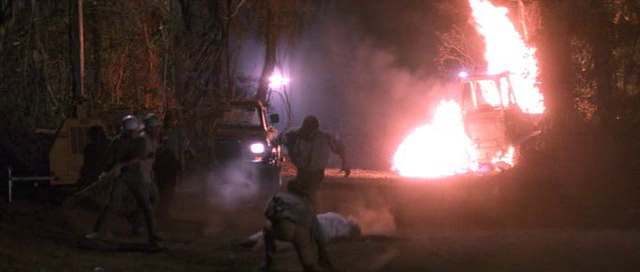 Le duel final de Predator se déroule dans la jungle obscure une fois traversé le seuil, une fois passé le pont formalisé par un immense arbre renversé enjambant le précipice et sur lequel l’indien s’offre en sacrifice.