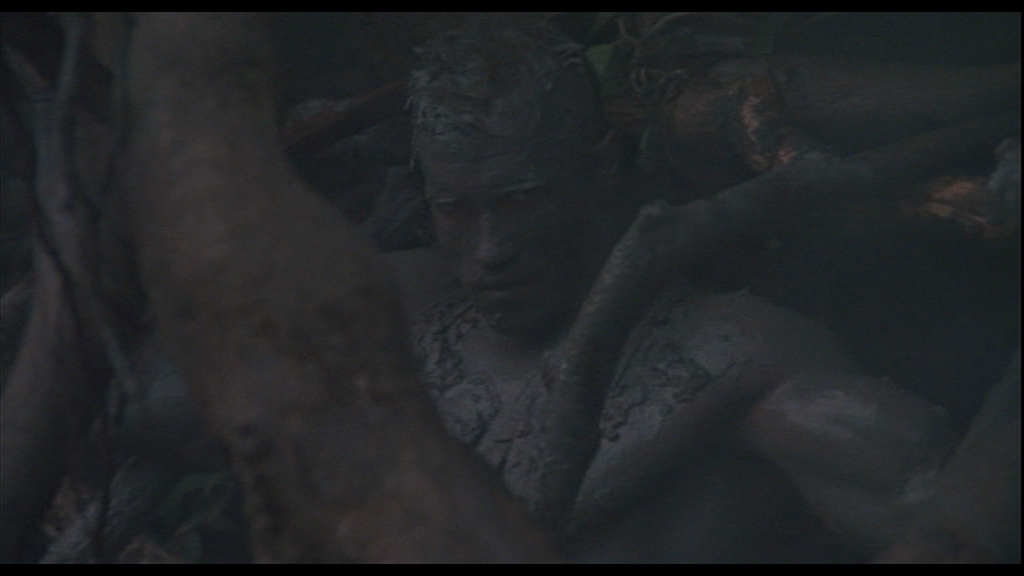 Le salut pour le héros proviendra de sa capacité à se fondre dans le décor, Predator est particulièrement exemplaire de ce point de vue là, notamment par le biais du staccato, les trois raccords dans l’axe montés en jump-cut, débutant sur Dutch brandissant une torche et poussant un cri bestial et finissant en plan large où l’on ne distingue quasiment plus l’humain de la végétation qui l’entoure. Une créature d’ailleurs caractérisée par son camouflage technologique auquel Dutch oppose un camouflage organique (la boue dont il est recouvert).