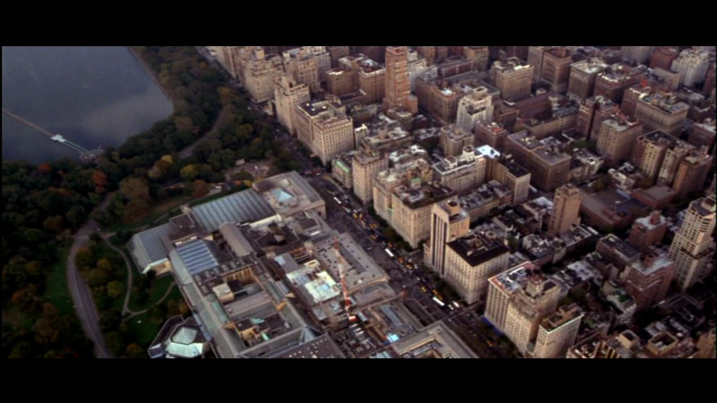 Peu après, sa visite au musée, on le retrouve arrivant dans le gratte-ciel siège de son enreprise. Il y est mis en valeur par un traveling arrière en contre-plongée, magnifiant sa stature et accentuant sa domination sur l’espace. Ce qu’entérine le plan où, regardant par la fenêtre de son immense bureau perché au sommet du gratte-ciel siège de sa société (sa tour d’ivoire ? Sa forteresse de solitude ?) le reflet de son visage en surimpression semble imprégner le panorama de la ville.