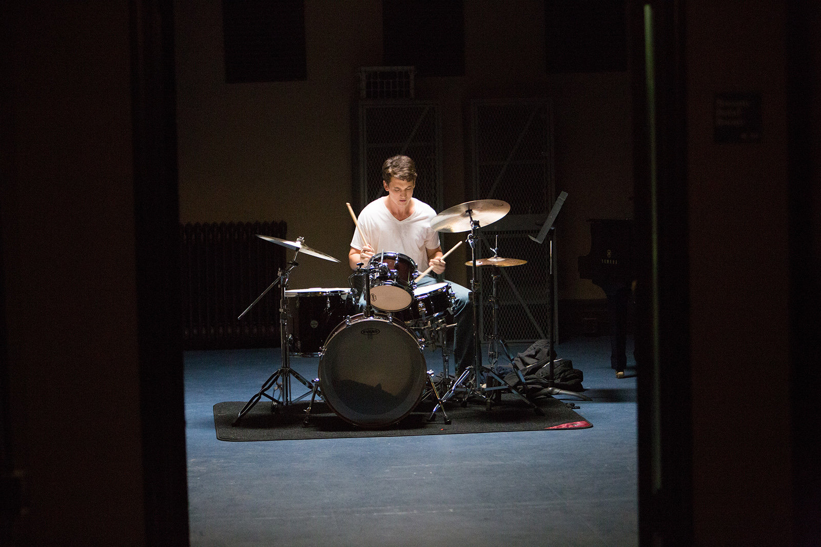 Inspiré de la propre expérience de Damien Chazelle, Whiplash est moins un film sur un modèle d’éducation que sur la relation entre les deux fortes personnalités. Et la manière de filmer cet affrontement prend vraiment aux tripes. Tout est une question de tempo. La mise en scène de Chazelle traduit parfaitement cette balance et épouse en premier lieu le tempo imposé par Fletcher et qu’Andrew recherche et poursuit désespérément. Jusqu’à se perdre et à être profondément blessé après un accident de voiture lorsque le novice cherchait à rattraper son retard, pour être à l’heure au concert mais également satisfaire les attentes de Fletcher. Dès le départ, le lien qui les unit apparaissait sinon maudit du moins empreint d’une irrépressible force d’attraction que tout le film portera jusqu’à l’incandescence. En effet, lors de la scène inaugurale, on nous montre Andrew s’entraîner seul dans la pénombre d’une salle du conservatoire, lorsqu’apparaît dans l’embrasure de la porte le professeur Fletcher. Comme si le rythme de percussion du jeune homme avait convoqué le bon génie capable d’exaucer ses rêves. Ou plutôt un démon vu le comportement. Peut être même l’incarnation du propre démon intérieur d’Andrew à qui il n’hésitera pas à se livrer corps et âme étant donné l’ascèse dans laquelle il plongera pour parfaire ses aptitudes.