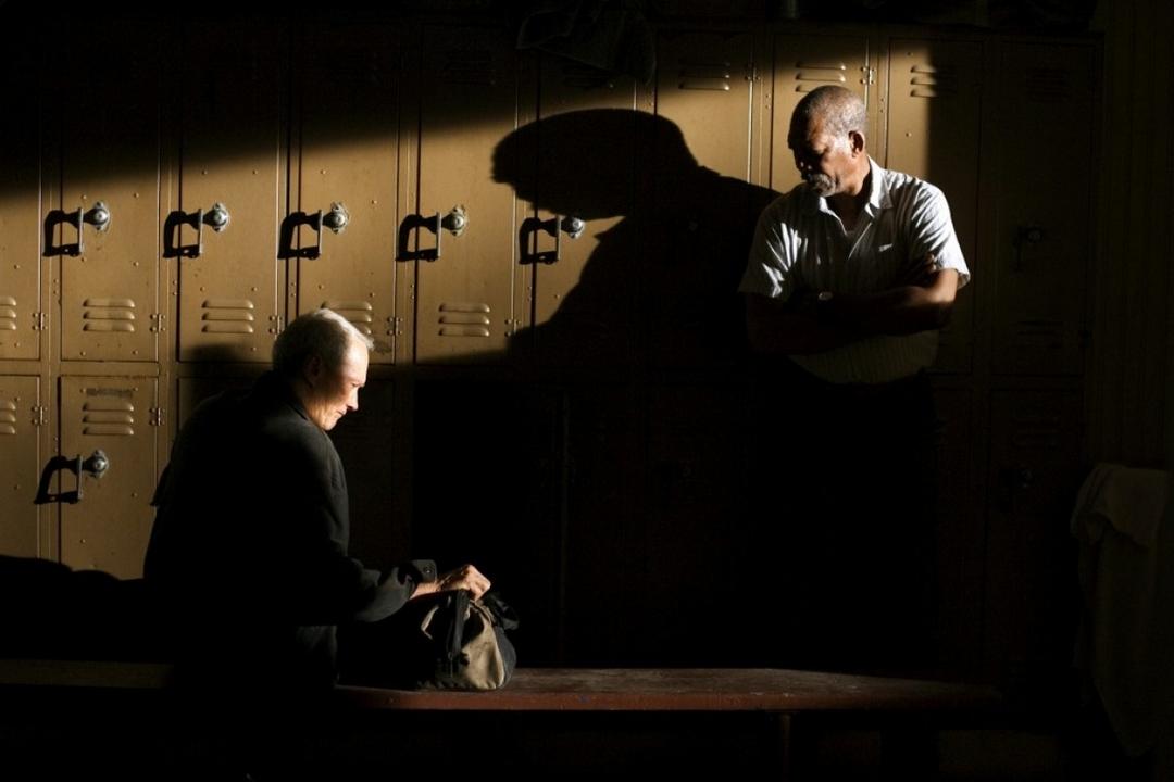 Sur la photo ci-dessus, on peut voir les deux compères de longue date, Scrap et Frankie, discuter dans les vestiaires. Pour cet instant dramatique, les visages des deux protagonistes sont partiellement plongés dans l’ombre. Cet effet permet d’instaurer entre Eastwood et Freeman une ambiance qui amène à percevoir le vestiaire comme un confessionnal, l’un des personnages attendant l’absolution de l’autre. Cette relation entre les deux septuagénaires est à l’opposée de celle que vit Frankie avec le prête de sa paroisse ; Contrairement à cette scène avec Scrap, les scènes avec le prête se déroulent en plein jour.