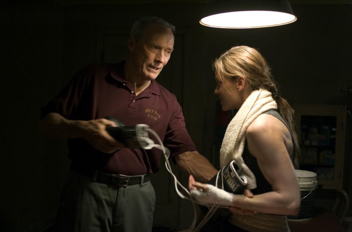 Sur la photo ci-dessus, Maggie s’entraîne donc de nuit au sac de frappe. La lumière magnifique du directeur de la photographie Tom Stern, se focalise sur le mur en arrière-plan. La silhouette de la boxeuse se dessine dans le noir au premier plan. Sa volonté est sans faille et elle y arrivera coûte à coûte. La lumière sur le mur rappelle qu’un espoir est possible et que, au final, Frankie se laissera convaincre. De plus, éclairée magnifiquement par Tom Stern, la pancarte au milieu du plan où figure la devise de la salle agit telle une pensée matérialisant clairement l’envie et l’ambition de la boxeuse ce qui motive son obstination. Toutefois, l’absence de lumière au premier plan annonce des lendemains qui déchantent.