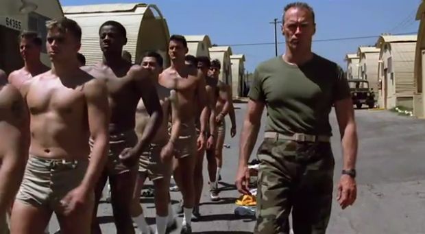 Vieille ganache va-t-en-guerre, le sergent Highway, joué par Eastwood, présente tous les défauts des bidasses de carrière qui peuplent l’œuvre de John Ford : l’armée est sa famille, sa raison d’être, son foyer loin duquel il dépérit. À ce personnage d’une autre époque, véritable « héros debout » bardé de médailles (c’est son compagnon d’armes qui en parle ainsi), Eastwood oppose tout à la fois les bleus-bites et les jeunes officiers qui n’ont gagné leur grade que dans des écoles militaires, jamais sur le terrain. Sorti quelques mois avant le Full Metal Jacket de Kubrick, Le maître de guerre est lui aussi divisé en deux parties : d’abord l’entraînement sur un mode volontiers railleur, puis le théâtre des opérations. Censé se dérouler en 1983, la guerre qui occupe alors l’armée américaine est l’invasion de la Grenade, une île au large du Venezuela. Eastwood ridiculise l’Operation Urgent Fury et renvoie toute la première partie à un questionnement lelouchien : tout ça pour ça ? Le maître de guerre prend soudain une réelle dimension antimilitariste que les spectateurs n’ont pas forcément admise. N’oublions pas que le film sort en pleine ère Reagan, qui marque le retour des vaillants petits soldats prêts à en découdre avec le méchant ennemi. Des sauveurs du monde, quoi ! Heartbreak Ridge est tout sauf la copie de ce genre d’aventures guerrières. Il y a dans la description de l’invasion de Grenade une ironie que l’on retrouvera dans Flags of Our Fathers (2006, Mémoires de nos pères). Malgré cela, les militaires old school que le cinéaste se plaît à décrire dans Le maître de guerre et la position de l’individu face au groupe, tout cela se retrouve déjà chez John Ford.
