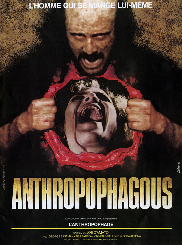 C’est alors que s’ouvre la « période gore » de D’Amato, celle qui nous offre ses deux films les plus connus, Blue Holocaust et Anthropophagous, ce dernier célèbre pour deux séquences cultes : dans la première, le monstre avale tout cru un fœtus ; dans la seconde, il dévore ses propres entrailles. Les citations de D’Amato sont d’ailleurs amusantes lorsqu’il parle de ce dernier film. Ainsi, l’utilisation de la « paillata », spécialité gastronomique romaine — en fait, des intestins de vache —, pour figurer les viscères de George Eastman que celui-ci va déguster à pleines dents.