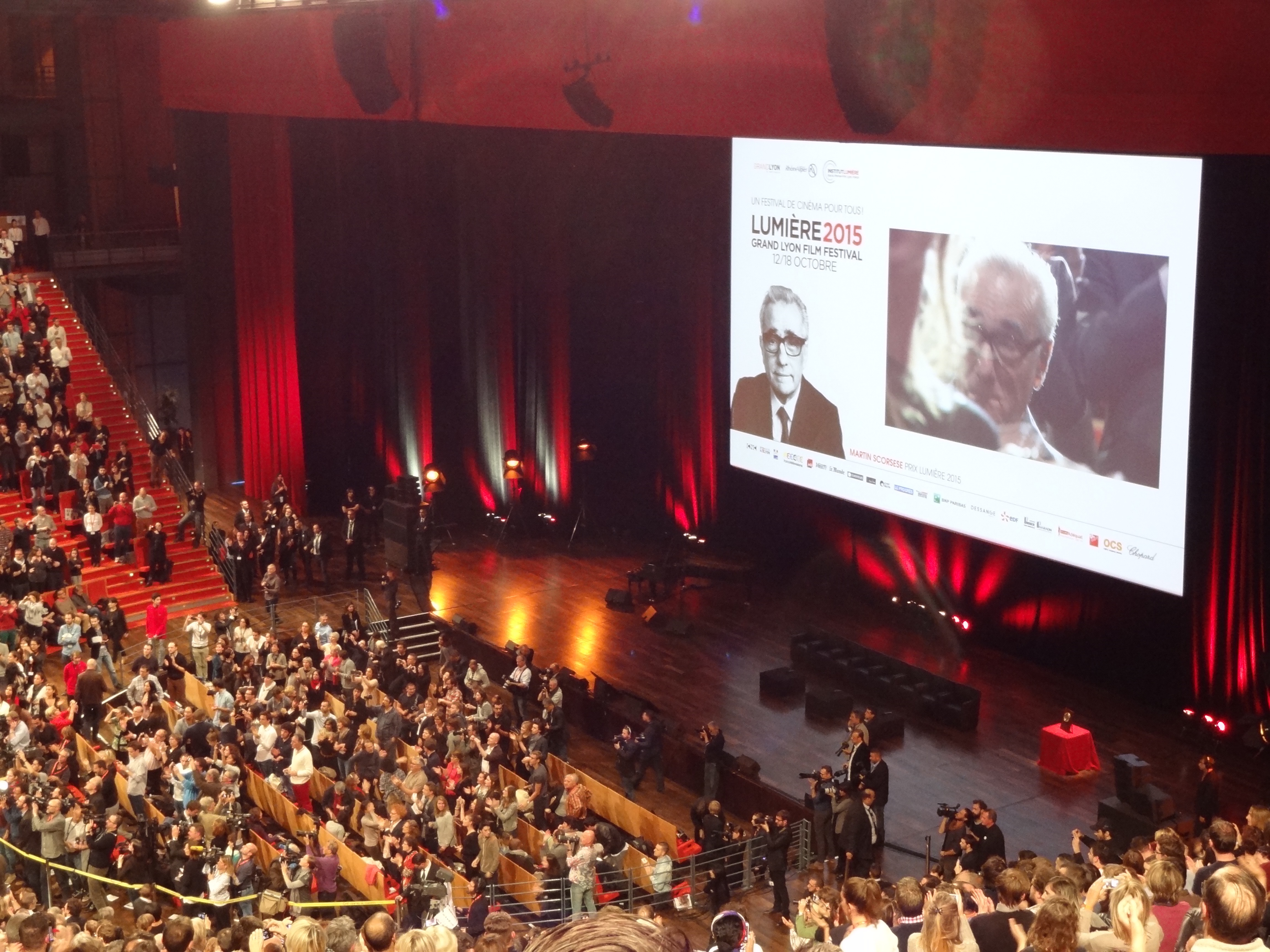 Il est temps de faire monter sur la scène les invités du cinéaste, au nombre desquels les acteurs Max von Sydow, Geraldine Chaplin, François Cluzet et Emily Mortimer, les cinéastes Abbas Kiarostami, Elias Suleiman, Matteo Garrone, Tony Gatlif, Jean-Pierre Jeunet et Souleymane Cissé, le décorateur Dante Ferretti, Olivia Harrison — la femme du Beatle George, à qui Scorsese a consacré un documentaire —, la productrice Margaret Bodde, le directeur de la cinémathèque de Bologne Gianluca Farinelli… L’habituel maître de cérémonie du prix Lumière, Bertrand Tavernier, ne pouvant être présent pour cause d’opération, il avait envoyé un texte lu par Thierry Frémaux et François Cluzet, rappelant que Scorsese était nommé « le Kurosawa de la 42e rue » « Comme ta passion est contagieuse, notait justement Tavernier. Dès la création de ce festival, j’ai pensé que le prix Lumière était pour toi ! »