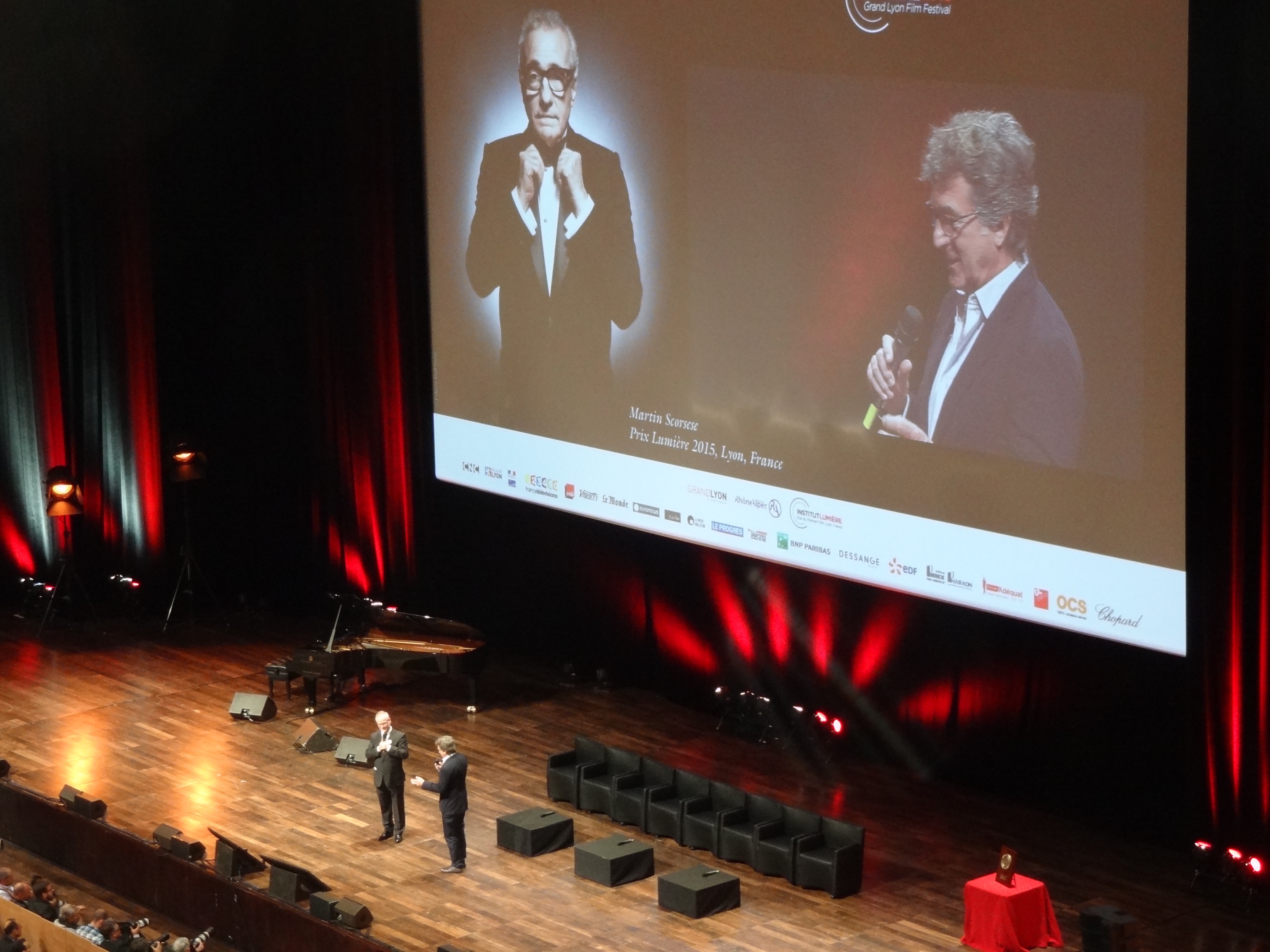 Dédié à Chantal Akerman, qui devait présenter Je, tu,il, elle, et à l’historien Raymond Chirat, tous deux disparus ces dernières semaines, le festival a connu son point d’orgue lors de la remise du prix Lumière, devant un parterre d’invités prestigieux. Il y eut quelques chansons, Camelia Jordana avec New York, New York et Jane Birkin reprenant As Time Goes By. De la musique avec le piano de Jean-Michel Bernard. Une vidéo de 25 secondes de Bob De Niro qui, en tournage dans la Grosse Pomme — il interprètera Bernard Madoff dans un téléfilm réalisé par Barry Levinson —, souhaitait un bon prix à son copain Marty. Un court-métrage d’Abbas Kiarostami, coprésident de la Cinéfondation à Cannes avec Scorsese, qui s’était déplacé à Lyon pour la circonstance. Et l’intervention de François Cluzet, partenaire de Scorsese dans une séquence d’Autour de minuit de Tavernier, ravi d’avoir eu « un partenaire aussi balèze ».