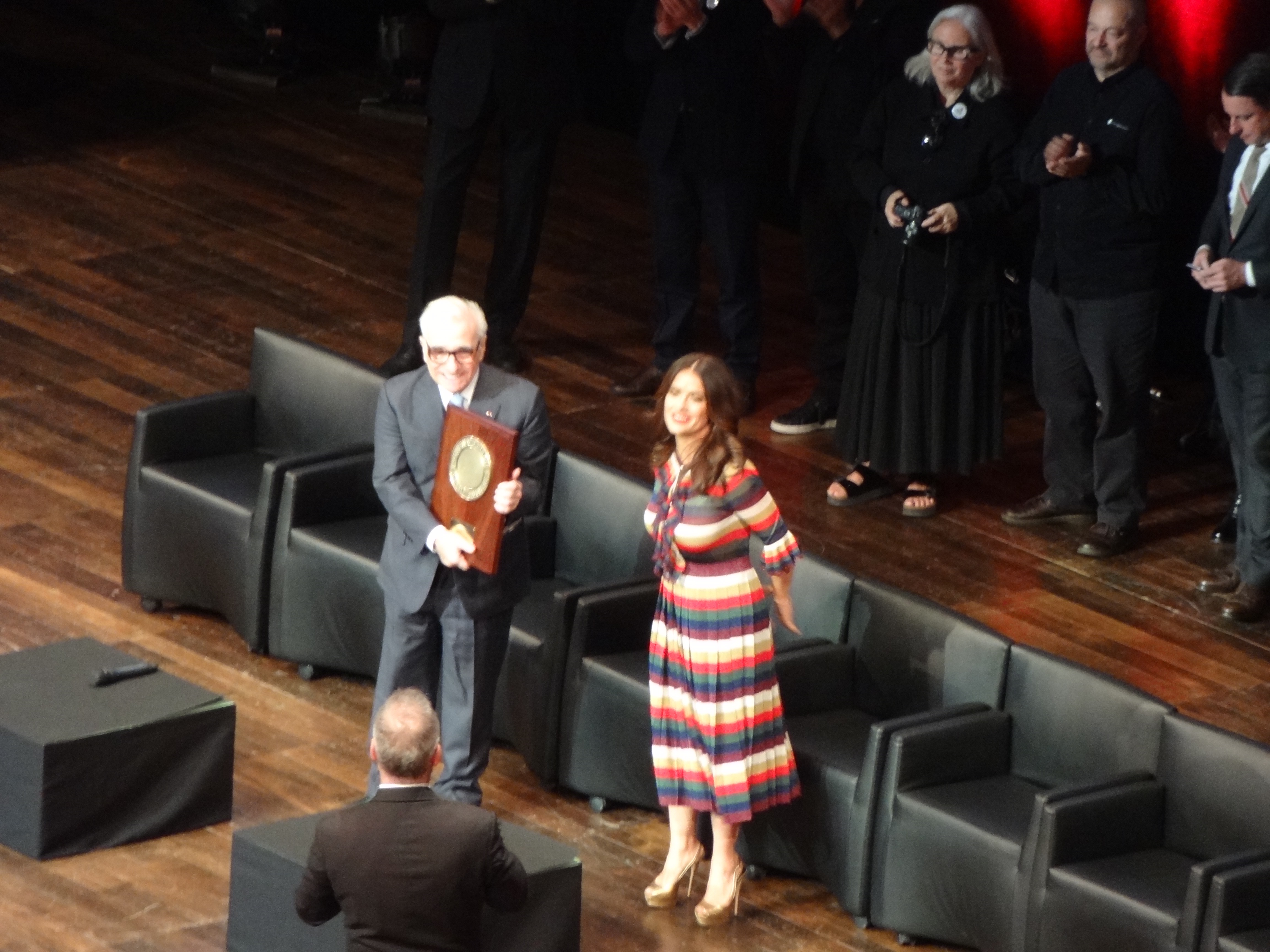 C’est curieusement Salma Hayek qui remet, sans rien dire, le prix Lumière à Martin Scorsese. Habituellement, ce sont des proches du cinéaste — Marisa Paredes et Rossy De Palma pour Almodovar, Uma Thurman et Harvey Keitel pour Tarantino —, ou tout au moins des gens ayant travaillé avec lui qui se déplacent : Cécile de France pour Eastwood, Éric Cantona pour Loach, Fanny Ardant pour Depardieu. La salle — et ce serait vraiment stupide de prétendre le contraire — était très excitée par la présence de la ravissante Salma mais tout le monde se disait qu’elle aurait pu être là mais aussi, puisque De Niro était en tournage, pourquoi pas Di Caprio ou Joe Pesci ou Matthew McConaughey ou à nouveau Keitel ?