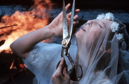 Jarman vient d’apprendre qu’il était séropositif et son film n’en est que plus contestataire, anarchiste, punk. « Vous avez aimé les Malouines ?, demande-t-on à un militaire. — Oui, madame ! — J’espère que la prochaine guerre, ce sera un gros conflit. — J’espère, madame ! » Qu’est-ce que l’homme, semble se questionner Jarman. Un mec seul qui marche parmi les flammes ? Les personnages de ce vieux super 8 de famille, guindés, mimant le bonheur ? Ce gars qui, désespéré, tente de faire l’amour à un poster de Bacchus ou à un militaire encagoulé ? On retiendra surtout la très belle séquence finale au cours de laquelle Tilda Swinton, en robe de mariée battue par le vent, se livre à une chorégraphie digne de Loie Fuller. Et ce que fait Tilda, on ne peut que l’apprécier !
