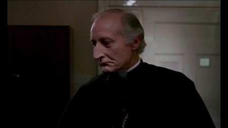 Il va être question de meurtres dans Mortelles confessions, de meurtres filmés de prime abord comme dans un giallo, ces films de tueurs en série dont les Italiens raffolaient à la même époque. On ne voit du coupable que les mains gantées et la silhouette vêtue d’un manteau noir. Mentionnée plus haut, la critique de l’Église se fait en deux temps. Le vieux confesseur qui s’amuse à poser aux jeunes femmes des questions sur leur sexualité est certes plus que contestable, pour ne pas en dire plus sur ce personnage d’envergure incarné puissamment par Anthony Sharp. Dans le bonus, Alain Petit explique que le rôle avait d’abord été proposé à Peter Cushing qui, engagé ailleurs, avait dû refuser. Ce n’est pas sûr qu’on y perde, tant Sharp se montre à la hauteur. Plus tard, toujours en ce qui concerne le questionnement du clergé, c’est un jeune curé (Norman Eshley) qui discute avec un homologue beaucoup plus âgé (Mervyn Johns) de la possibilité du mariage des prêtres, le plus vieux acceptant sereinement cette idée.