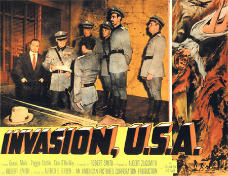 Un mot encore sur Invasion USA (1952) que signe le vétéran Alfred E. Green (il réalise ses premiers films en 1916). Voguant sur la vague anticommuniste, ce curieux récit décrit la destruction des États-Unis par des troupes vêtues d’uniformes américains et parlant anglais (quelle sournoiserie) qui ressemblent fort à l’Armée rouge. Une paranoïa qui fit long feu dans la cinématographie américaine puisqu’en 1984, dans Red Dawn (L’aube rouge), des ados luttaient contre une invasion communiste et que, l’année suivante, au cours d’une autre Invasion USA, Chuck Norris devait affronter à nouveau de méchants communistes,un mélange de Cubains et de Soviétiques.
