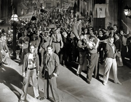 Aucun plan n’est gratuit. Cette jeunesse des années trente — le casting est majoritairement juvénile — a été mortifiée par la guerre (DeMille filme, dans la fac, le tableau de ceux qui sont tombés au front) et a besoin de s’amuser. D’où l’enchaînement des étudiants qui quittent, pour rire, la boutique de leur ami tailleur à genoux, avec ce plan d’un cabaret où les danseuses sont elles-mêmes à genoux. Curieusement aussi pour l’époque, le cinéaste glisse parmi les étudiants un juif et un noir, comme si rien des différences ethniques ou religieuses ne devait poser problème. Il signe aussi des plans inédits à l’époque comme la terre jetée sur un cercueil, filmée depuis le trou.