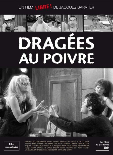 Un film libre !, déclare l’affiche de Dragées au poivre de Jacques Baratier, que les Films du Paradoxe ressortent en DVD en version restaurée. Libre avec un point d’exclamation. On se demande aujourd’hui comment pouvait être reçu un tel film à sa sortie, en 1963. Libre, le scénario l’est qui passe en revue, sous prétexte de tourner du cinéma-vérité, tous les genres cinématographiques de l’époque : Nouvelle Vague, comédie populaire, comédie musicale, film à sketches, drame italien à la Antonioni (l’épisode joué par Monica Vitti et Roger Vadim) ou à la Fellini (les prostituées dans la rue). Curieusement, dans un article publié dans Positif en 1982 et consacré à La dame de Shanghai, qui n’a vraiment rien à voir avec les Dragées en question (on peut retrouver ce texte dans le livre qui accompagne le coffret de Carlotta dédié au film d’Orson Welles), le critique Petr Kral écrit : « Si ce qui m’a fait venir au cinéma était un espoir, c’était bien celui de voir les films renouveler mon goût du réel en me le donnant à feuilleter comme un fabuleux livre d’images. » Son éloge des labyrinthes wellesiens pourrait s’adapter au kaléidoscope proposé par Dragées au poivre. Certes, chez Baratier et son scénariste-dialoguiste et acteur principal Guy Bedos, le ton se fait beaucoup plus léger, nettement moins auteuriste. Mais le film propose bien une vision kaléidoscopique du Paris de 1963 avec ses jeunes épris de Nouvelle Vague et de cinéma-vérité, ses prostituées, ses touristes allemands en goguette, ses cabarets, ses salles de sport, etc. Surtout, le film se moque gentiment de tout ce qui envahit les écrans.