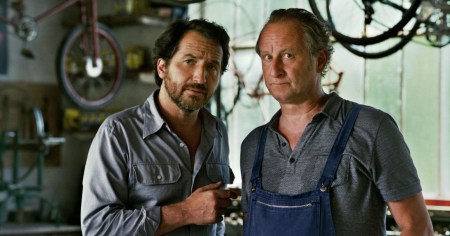Raoul ne montera finalement que très peu sur son vélo, quelquefois sur la selle et pas du tout en danseuse. De celle-ci, le personnage a malgré tout la grâce et la fragilité, la poésie du cygne blessé. Le film de Pierre Godeau suit ainsi gentiment Raoul à tous les âges (adulte, c’est Benoît Poelvoorde) sans que jamais il n’ait pu avouer à qui que ce soit son handicap. On pourrait reprocher bien sûr à cette micro-société d’être un peu rance, franco-française, éloignée des vrais problèmes mais aurait-on le culot de faire les mêmes griefs au Jour de fête de Jacques Tati, par exemple, que Pierre Godeau avoue avoir revu pour la préparation de son film ainsi que de nombreux autres longs-métrages du grand Monsieur Hulot, un personnage avec qui Tati se confond ? Non, bien sûr. Bon, n’exagérons pas : Godeau n’est pas Hulot, Raoul n’a pas récupéré son vélo chez Tati mais l’ombre et l’âme de Sempé, sa poésie, flottent sur ce film qui se bonifie chaque fois que l’on pense à lui. Car, comme chez Sempé, ce qui paraît gentillet et simple à première vue prend de l’étoffe, de l’épaisseur. Les personnages qui peuplent le village ne sont ni gais ni tristes, ils se contentent de vivre dans un simili-confort, sans problème apparent (alors que, c’est bien connu, les enjeux métaphysiques restent cachés), tellement accrochés à leur vie sans histoire qu’ils se croient obligés de transformer les mots, de les sacraliser en les désignant par le nom de celui qui les représente. Vous ne comprenez pas ? Puisque les lunettes sont vendues par M. Bifaille, on les appelle désormais des bifailles. Le vélo, ce sera le taburin puisque Raoul les répare et la photo, la figougne, une fois qu’aura débarqué dans le village Hervé Figougne (Édouard Baer), photographe de son état. On ne peut pas nier cet aspect Amélie Poulain qui colle à Raoul Taburin, ce qui est somme toute normal, Guillaume Laurant ayant participé à l’écriture des deux opus.