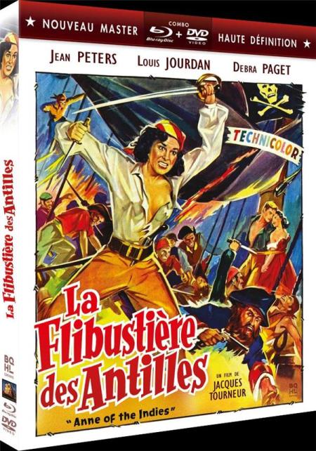 Le cinéma hollywoodien dans ce qu’il a de plus pur et de plus formidable, voilà bien ce qu’est La flibustière des Antilles (1951), que BQHL ressort dans un combo DVD + Blu-ray. Tout y est : les couleurs, les décors, les costumes, les transparences, l’action, le Technicolor de la Twentieth Century Fox, etc. Depuis les années 20 et le fameux Pirate noir interprété par le bondissant Douglas Fairbanks, les films maritimes ont ravi les gosses du monde entier. Capables, en sortant de la salle, de se battre avec des épées imaginaires des heures durant et de crier des phrases incompréhensibles du style « Carguez la civadière », celle-ci entendue d’ailleurs dans La flibustière. Et qui signifie… En fait, c’est « Repliez la petite voile » mais peu importe, ça sonne tellement mieux. Dès 1935, Errol Flynn a pris la suite de Fairbanks dans ces histoires où un héros pur et dur combat pour la bonne cause sur les mers du monde entier. Jacques Tourneur bouscule la donne en faisant de son héros… une héroïne, Anne Providence, qui donne son titre original au film, Anne of the Indies.