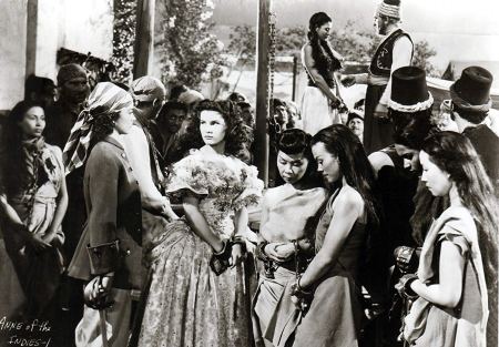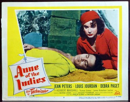 On sait que Jacques Tourneur est un cinéaste considérable et jamais il ne peut être pris en défaut de se désintéresser de son sujet. Il n’est qu’à voir cette séquence au cours de laquelle Anne et Barbe Noire se disputent au sujet de Pierre-François La Rochelle (Jourdan, donc). Le redoutable pirate quitte l’île et Tourneur filme en plongée sa descente dans la barque qui l’amènera à bord de son vaisseau. A partir de là, le cinéaste fait glisser les codes et son film de pirates s’incline doucement vers le récit d’un drame conjugal dans lequel un homme, Jourdan, va se retrouver pris entre deux cœurs, ceux de Jean Peters et de Debra Paget. Jusqu’à transformer son récit en portrait d’une femme amoureuse et blessée. Du grand art !