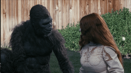 Mais reprenons du début. Schlock explore avec humour le thème du chaînon manquant entre le singe et l’homme, très à la mode à l’époque puisqu’il est au centre de Skullduggery (1970) de Gordon Douglas, qu’on en parle encore en 1975 dans un documentaire sur la légende du Bigfoot et que Picha en fera le sujet d’un film d’animation en 1980. L’absurdité règne en maître chez Landis qui fait de son héros un terrible tueur (le film ouvre sur une hécatombe de 239 victimes avec un tas de peaux de bananes sur les lieux du crime, d’où le banana spleen qui s’empare de la petite ville américaine où les faits se déroulent) mais aussi un sympathique animal confronté au monde stupide des humains. On découvre dans ce film plusieurs éléments qui vont être la marque de fabrique des films de John Landis, du ballet des voitures de flics qui zigzaguent sur les routes et qui vont trouver leur point d’orgue dans les deux Blues Brothers aux nombreux clins d’œil cinéphiliques. Et des gags complètements non-sensiques, tel le professeur Schlibovitz, spécialiste appelé sur les lieux du crime, et dont le prénom est Shirley, « un caprice » de ses parents.