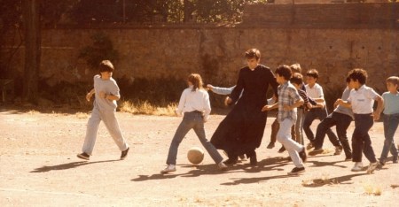 Et pour mieux affirmer cela, Moretti signe de très beaux plans. Son héros n’aime pas les autres car il est toujours en décalage avec eux, jamais dans le même mouvement. Quelle idée géniale de se filmer dans une barque immobile sur une étendue d’eau quand toutes les autres barques ne cessent d’aller et venir. Quelle autre idée géniale de se filmer seul, debout sur une plage, entouré de dizaines de couples allongés qui s’enlacent. Ce décalage, on le retrouve aussi dans La messe est finie lorsque le jeune prêtre qui vient d’être muté dans la banlieue romaine rencontre son prédécesseur, marié et père de famille.