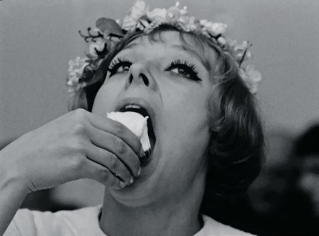 Reprenons du début. Les deux Marie de Vera Chytilova ressemblent à Anna Karina dans Pierrot le fou, sorti l’année précédente. « Qu’est-ce que j’peux faire, j’sais pas quoi faire » chantonnait sur une plage la muse de Godard. Nos deux jolies Tchèques pourraient s’approprier cette antienne tant elle leur colle à la peau. Alors, elles se prélassent sur leur lit, bouffent beaucoup, donnent rendez-vous dans des restos à de vieux messieurs qu’elles raccompagnent ensuite à la gare, passent du noir et blanc à la couleur, cassent des choses, découpent des choses. Ce qui donne droit à une très enthousiasmante séquence digne de Jean-Christophe Averty, lorsqu’elles tailladent l’image en mosaïque.