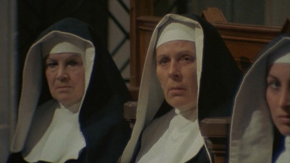 Mais avant de parler plus précisément des Novices, il faut encore mentionner deux films quasiment fondateurs : The Devils (1969, Les diables) de Ken Russell et Interno di un convento (1977, Intérieur d’un couvent) de Walerian Borowczyk. D’ailleurs, on est en droit de se demander si le pseudo choisi par Mattei pour signer ses Novices libertines, Stefan Oblowsky à la résonance « pays de l’Est », n’est pas un hommage caché à Borowczyk ? D’ordinaire, le cinéaste italien choisissait des noms beaucoup plus anglo-saxons pour tromper le public (une habitude que se sont partagés la plupart des réalisateurs transalpins de westerns, de gialli et de films d’horreur) : Vincent Dawn, Jordan Matthews, Jimmy Matheus, George Smith, Bob Hunter, Michael Cardoso, Frank Klox, Herik Montgomery, William Snyder, etc. Plaignons le spécialiste David Didelot et ses colistiers (Jérôme Ballay, Jean-Sébastien Gaboury et Didier Lefèvre), auteurs du seul bouquin publié en français sur le cinéaste (nous en avions parlé ici-même), qui ont dû avoir du mal à s’y retrouver là-dedans.