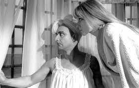Et puisque cet article a démarré sur le « scandale Polanski », voyons quel est le sort réservé aux personnages féminins dans ces trois films. Trois actrices — la débutante Jolanta Umecka, Catherine Deneuve et Françoise Dorléac — et trois manières d’aborder le rapport entre les deux sexes. Résumons rapidement les trois films. Dans Le couteau dans l’eau, un couple bourgeois prend en stop un étudiant et l’embarque dans une virée sur un lac. Sur la surface exiguë du voilier, les rapports se tendent entre les trois membres de l’équipée : le mari, sûr de lui, étale son savoir maritime et cherche à écraser l’étudiant sous l’œil scrutateur de la femme qui semble compter les points. Dans Répulsion, livrée à elle-même dans un appartement londonien, une jeune femme succombe à la répulsion qu’elle éprouve pour les hommes et sombre dans les tourments de la folie. Enfin, dans Cul-de-sac, un gangster surgit dans un château, dans le décor insolite et très beau de l’île de Lindisfarne (Northumberland, au nord-est de l’Angleterre), remarquable entre autres par la route d’accès submersible qui disparaît sous l’eau à marée haute. D’où les plans assez incroyables d’une voiture perdue en pleine mer. Et le gangster, donc, se retrouve face à un couple insolite, reprenant et renversant la situation du Couteau dans l’eau. Dans le film polonais, l’intrus subit la mauvaise humeur du mari. Dans Cul-de-sac, c’est au contraire un intrus qui dicte sa conduite au couple. Dans les deux cas, la femme est au centre du trio et joue de sa séduction. Dans les deux cas, elle se dévêt et attire la convoitise, sinon de celui qui la voit, en tout cas du spectateur.