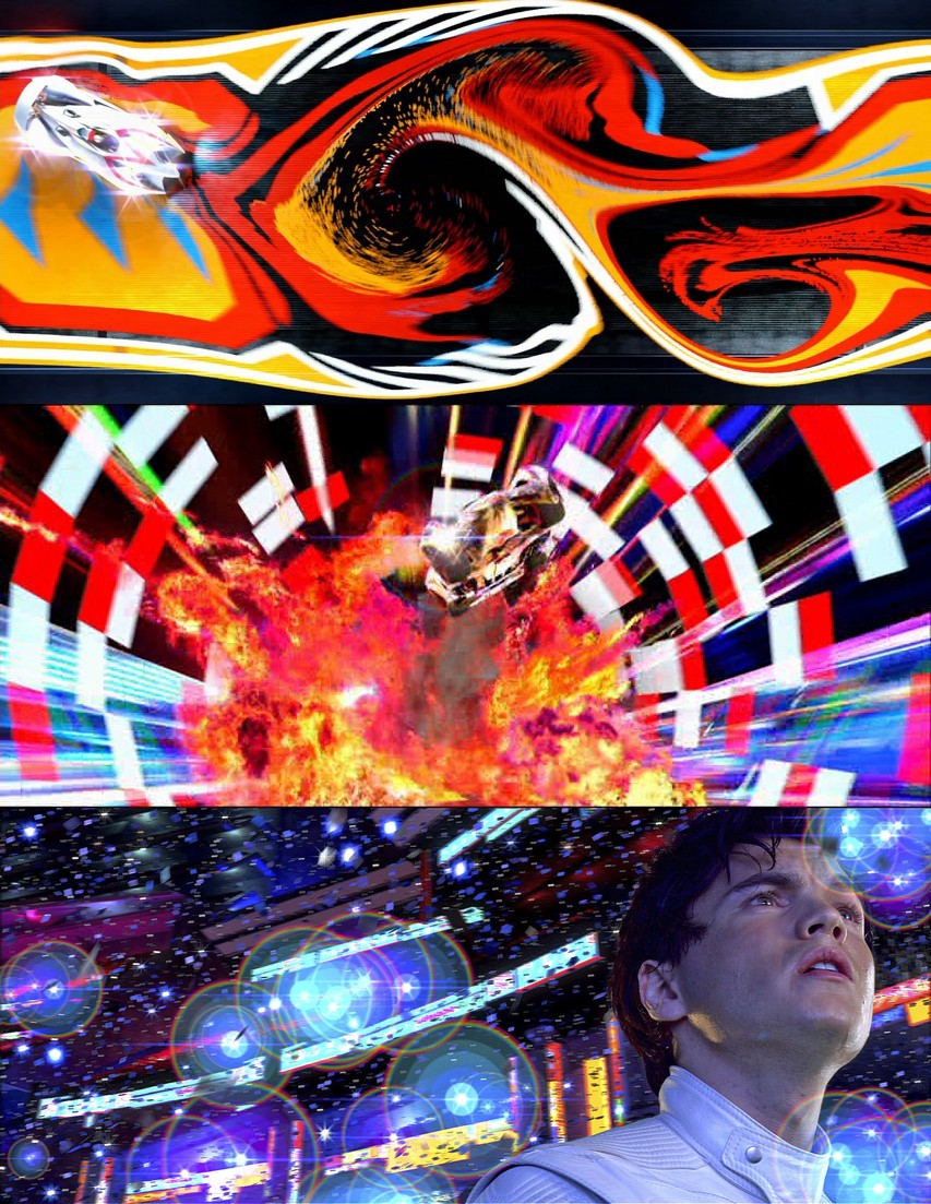 Le final cathartique de Speed Racer voit Speed, par son Art du pilotage, transformer son environnement pour ne faire plus qu’un avec lui et atteindre une sorte de Nirvana sensoriel et sensitif figuré par l’enchaînement de plans montrant l’enchevêtrement du décor du circuit avec sa voiture transportant Speed au-delà de ce que son cerveau perçoit (une expérience partagée par le spectateur lui aussi projeté avec délices dans ce maelström d’images, de musiques et de sensations) pour aboutir à une déflagration de flashs comme des étoiles explosant de toutes parts.