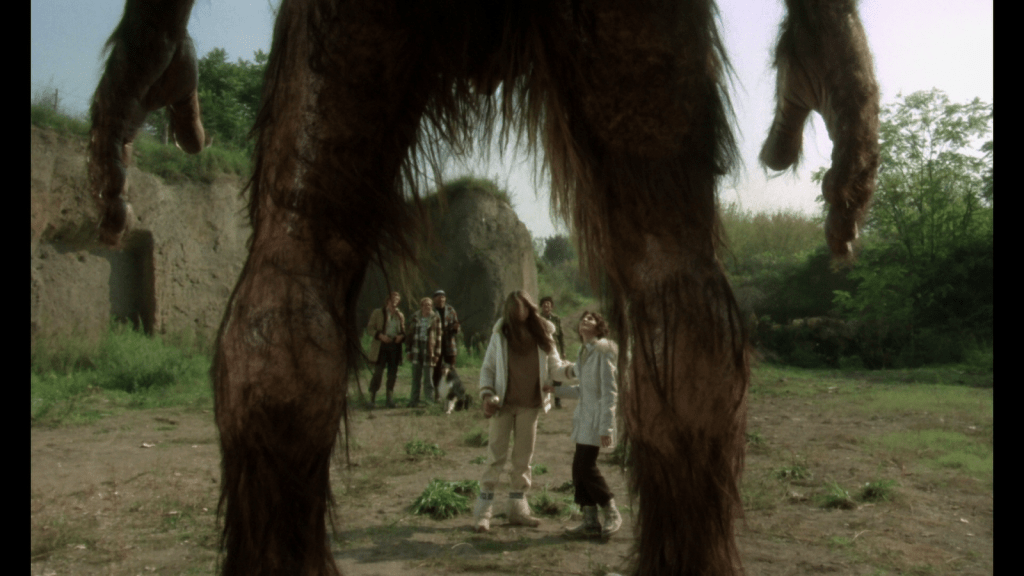 Jane et Herbie, les enfants qui se prennent d’amitié pour le grand type poilu étant jeunes — Antonella Interlenghi a 16 ans et son frère est plus petit encore —, Parolini et ses deux coscénaristes, Mario Di Nardo et Marcello Coscia, ne peuvent s’amuser à recréer l’érotisme du premier King Kong, celui de 1933. Ils se rattrapent avec des éléments susceptibles de plaire à un plus jeune public, tel le gentil chien qui accompagnent les enfants ou la pêche du Yéti qui leur offre à croquer un poisson cru.