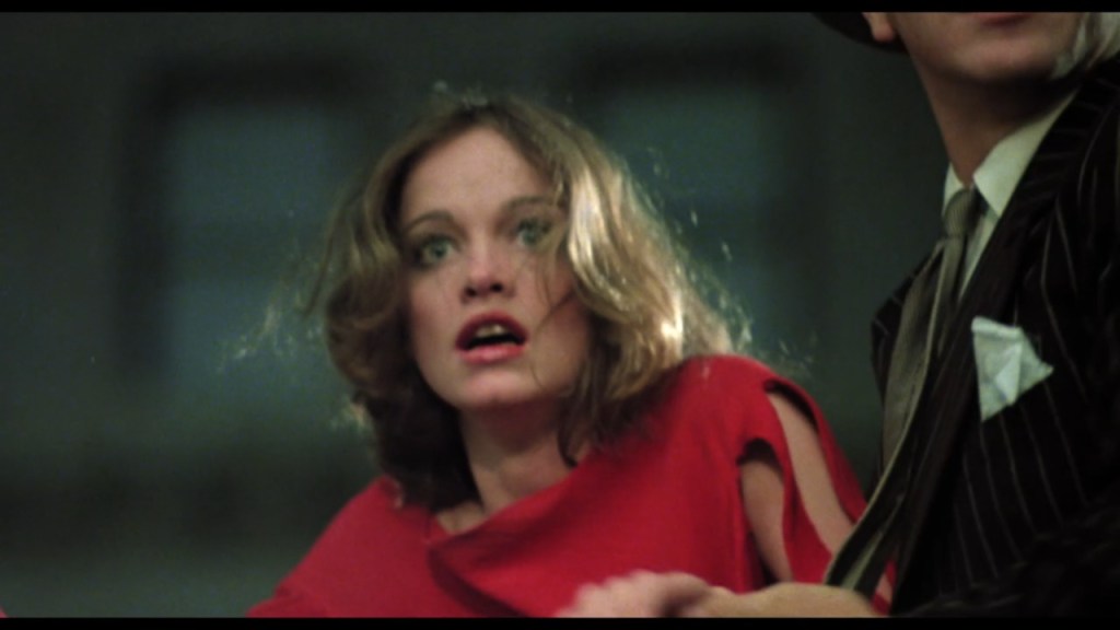 On pourrait penser que sa Lady in Red, qui arrive plus de dix ans après Bonnie and Clyde et le renouveau des films de gangsters des années trente, n’est qu’un film de plus qui décrit des braquages à l’époque de la Grande Dépression. Or, il n’en est rien car John Dillinger, un des personnages du film, n’arrive que très tard dans le récit. Lequel s’appuie plutôt sur Polly, jouée par Pamela Sue Martin, une pauvre fille qui subit toutes les violences inhérentes aux femmes à cette époque : la pauvreté rurale et la rudesse paternelle, les boulots de misère et l’exploitation sexuelle, le syndicalisme mal vu par la société et sa police, le passage par la prison, la prostitution, etc. Chaque épisode est ponctué par l’apparition d’un acteur ou d’une actrice. Ainsi, lorsque Polly passe son temps à coudre pour un salaire de misère, elle subit le harcèlement du chef d’atelier, belle composition du génial Dick Miller, acteur fétiche de Corman, dans un beau rôle de salaud. En prison, Polly aura à se frotter à Nancy Parsons, terrible et odieuse matonne. Enfin, dans le bordel, il lui faudra supporter un mafieux au surnom de Frognose (« Nez de crapaud »), joué par l’impeccable Christopher Lloyd.
