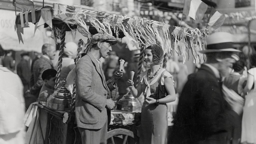 On retrouve d’ailleurs dans Quatorze juillet cette même ambiance populaire, qui montre le peuple s’amuser ou s’attraper pour un oui ou un nom — et très souvent pour des problèmes automobiles, déjà ! Un personnage sort du lot, joué par Paul Ollivier : celui d’un riche noctambule éméché faisant beaucoup penser à celui des Lumières de la ville de Chaplin, sorti en 1931. Curieusement, avec sa petite moustache brune et ses cheveux blancs, Ollivier s’est fait la tête qu’aura le même Chaplin dans Monsieur Verdoux (1947).