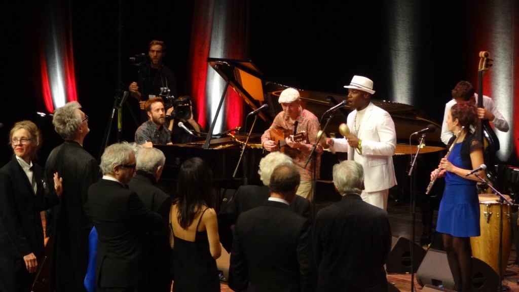 Wim Wenders était visiblement ému par tous les éloges entendus, ceux d’Alfonso Cuaron, de Vincent Lindon, d’Aurore Clément et d’Irène Jacob, auxquels s’ajoutaient une reprise du Perfect Day de Lou Reed par Jeanne Cherhal — Perfect Days étant le titre du film présenté cette année à Cannes par Wenders —, un air de piano composé par Laurent Petitgand pour Les Lumière de Berlin (réalisé par Wenders en 1995) et joué par lui et Chan Chan, une chanson que l’on entend dans Buena Vista Social Club (1999), reprise ici par le groupe Colectivo Caliente.
