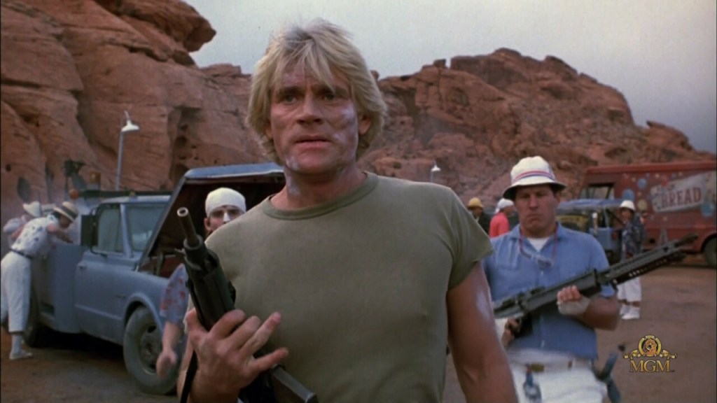 Dans cette Amérique détraquée, il suffit que le héros décline son identité et annonce sa ville d’origine (Anaheim), pour que son interlocuteur éclate de rire et toute l’assemblée avec lui. De Jarnatt multiplie ainsi les détails insolites. Dans un bar louche, David Andrews commande un rhum et un biscuit avant d’être interpellé par un individu suspect (Brion James) qui lui demande ce qu’il veut boire… et s’il prend un biscuit. Et bien sûr, on se demande : mais pourquoi un biscuit ? Quant au Sky Ranch perdu au milieu du désert, il est le symbole de l’Amérique triomphaliste des piscines et des jeunes gens lookés comme James Dean. De Jarnatt partage ce genre d’humour loufoque avec Matt Groening, l’auteur de Futurama et des Simpsons, son copain de chambrée à la fac (selon l’historien du cinéma et scénariste Fathi Beddiar, interrogé dans le bonus sur son amitié avec De Jarnatt).